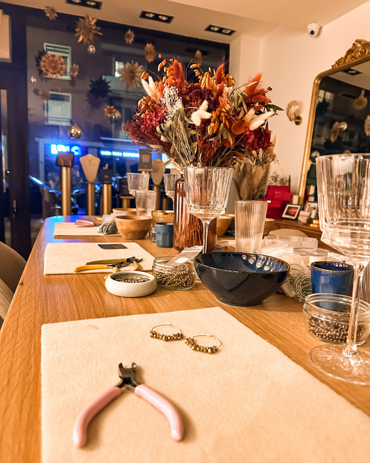 J'organise des ateliers afin de vous apprendre pas à pas à créer vos bijoux, c'est une idée originale pour passer un moment entre amies ou bien pour vos événements type anniversaires, EVJF.