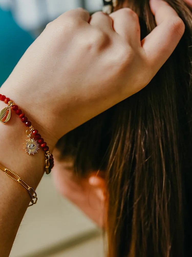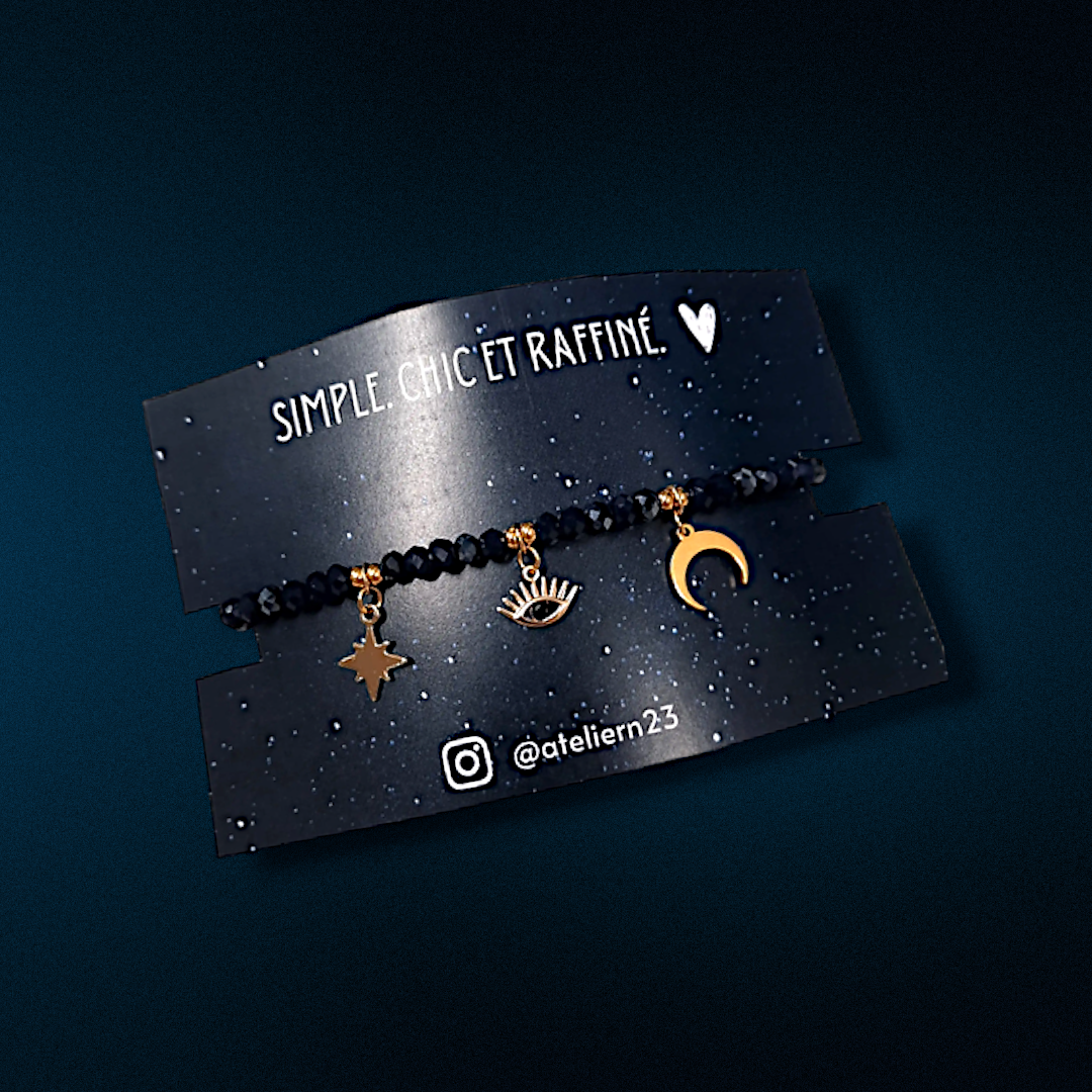 Bracelet élastique avec pendentifs en acier inoxydable. Personnalisez votre bracelet selon vos goûts avec les différents pendentifs disponibles : oeil, soleil, demi-lune, coquillage, étoile.