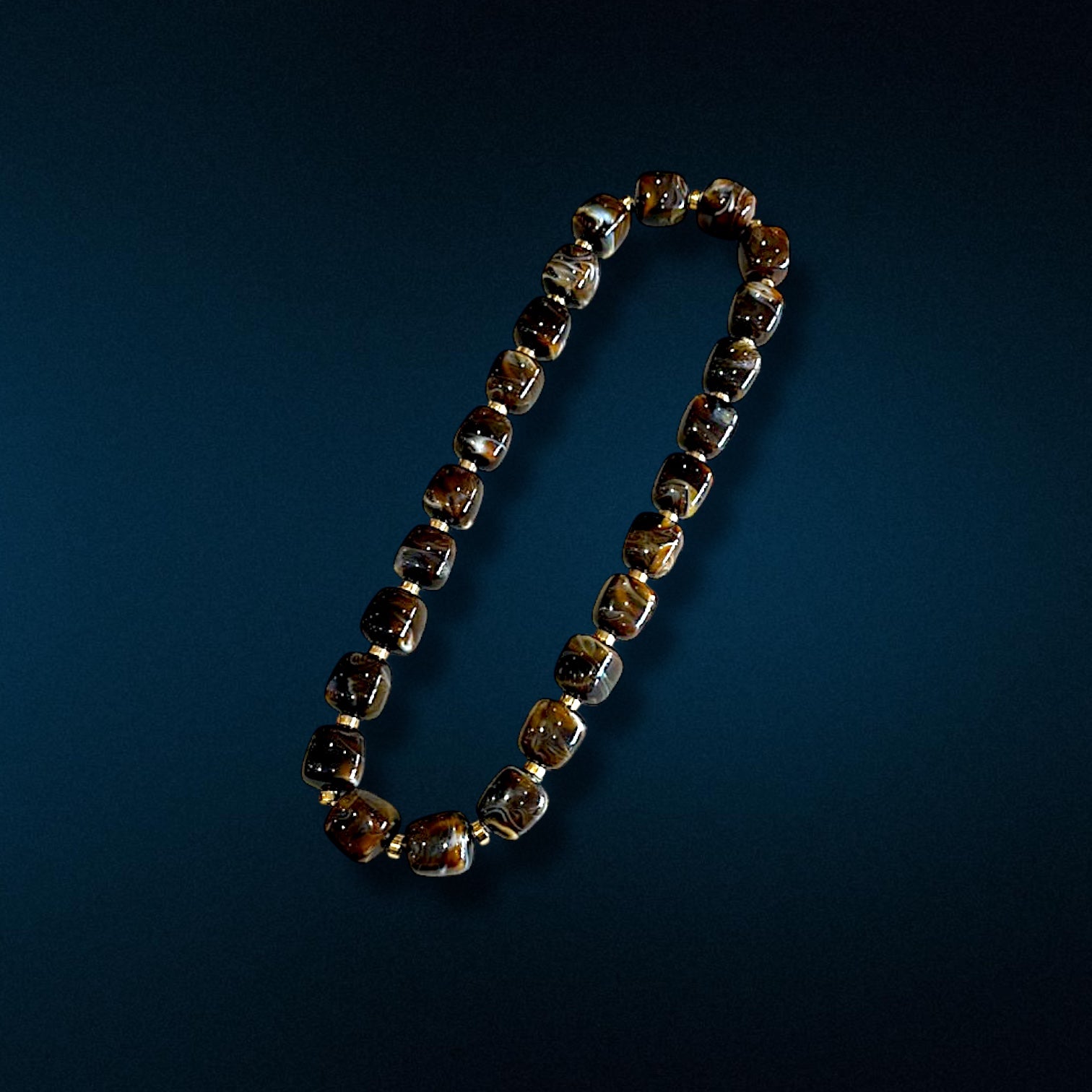 Collier élastique avec perles en résine, marbrées de différentes couleurs avec coupelle en acier inoxydable hypoallergénique. Taille standard.