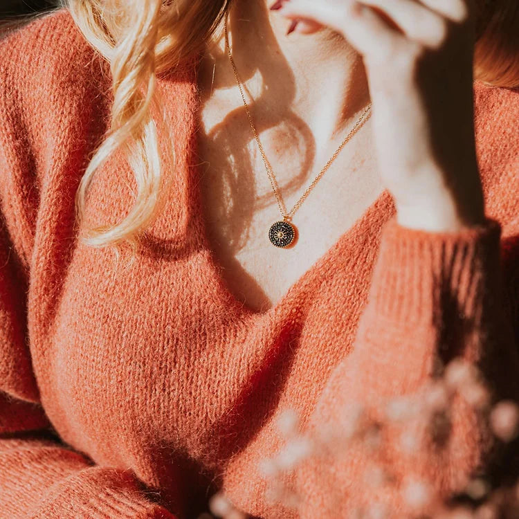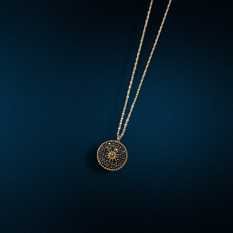 Collier en acier inoxydable avec chaîne fine de 45cm de longueur, avec une médaille noir pailleté avec une étoile dorée au milieu.
