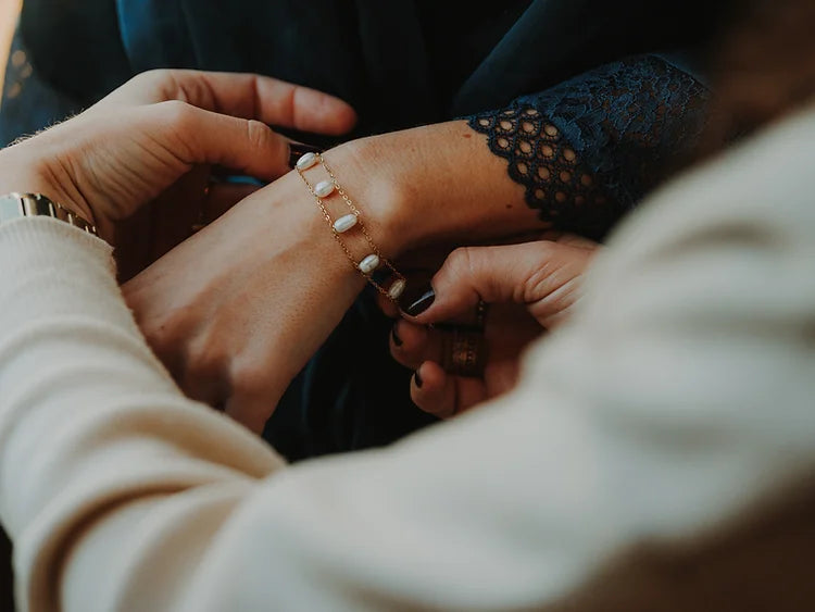 Bracelet en acier inoxydable sur deux rangs avec perles d'eau douce. Longueur ajustable.