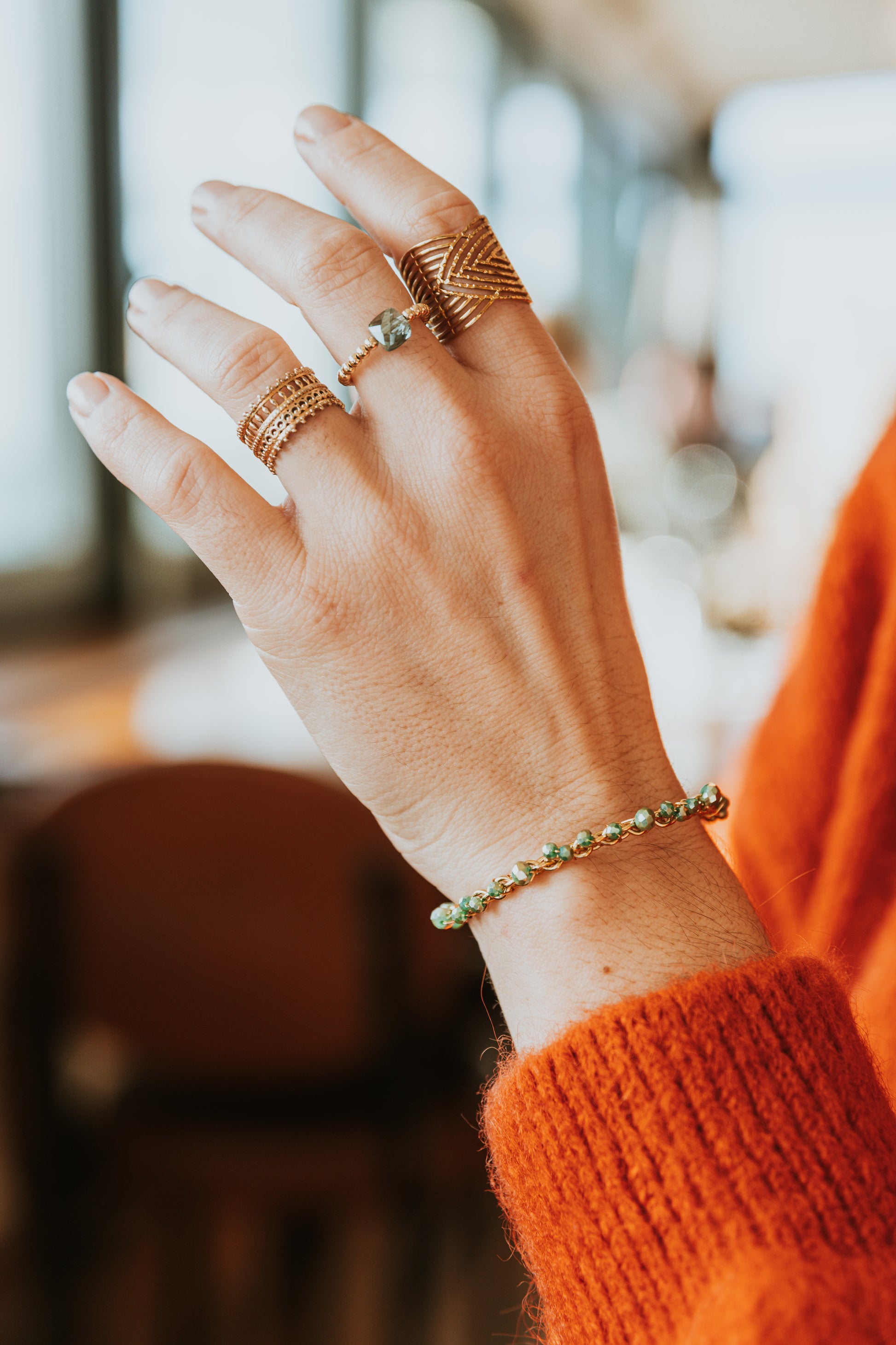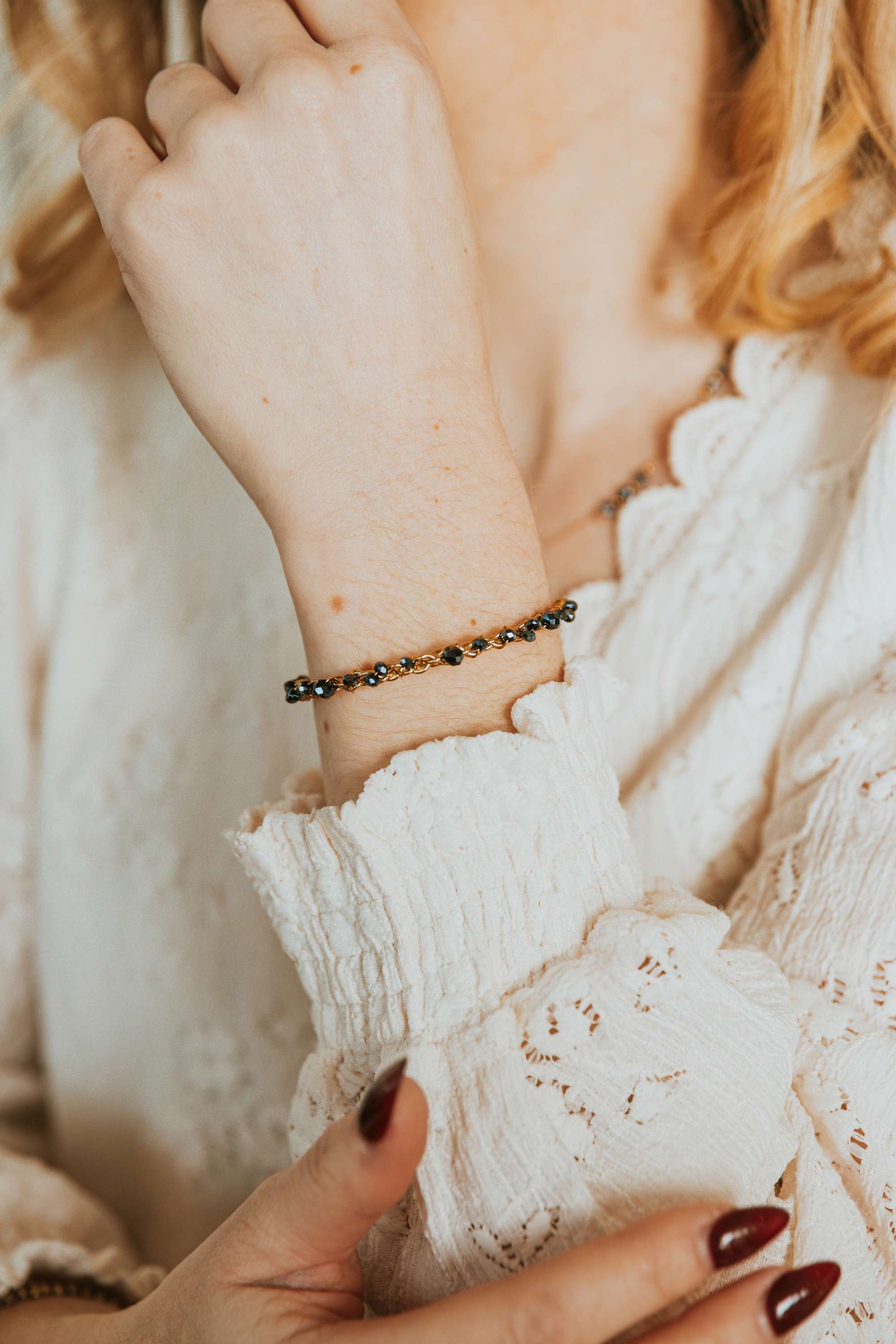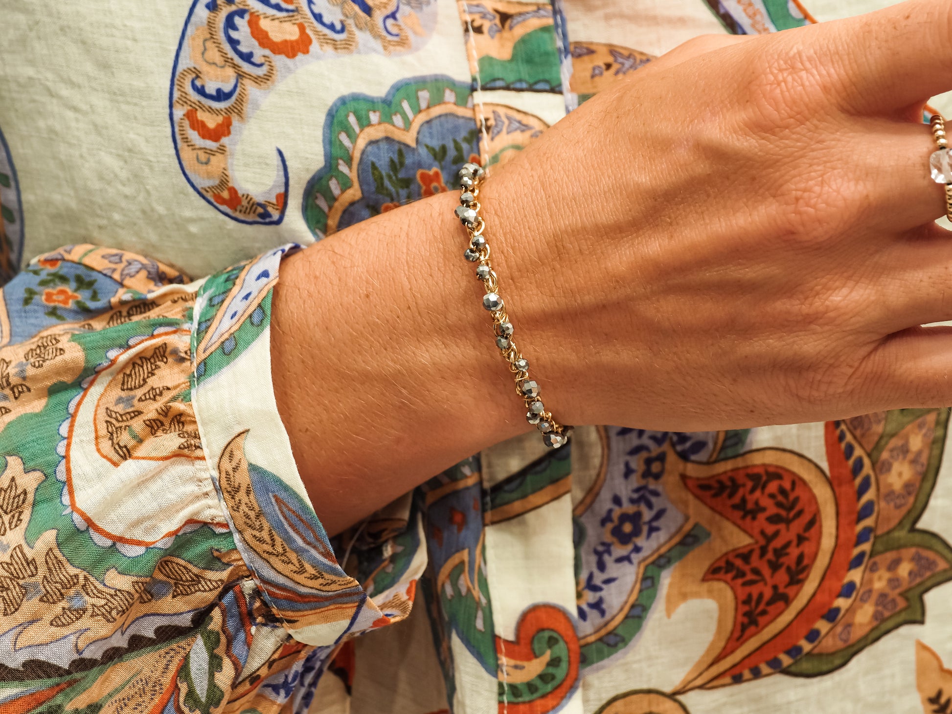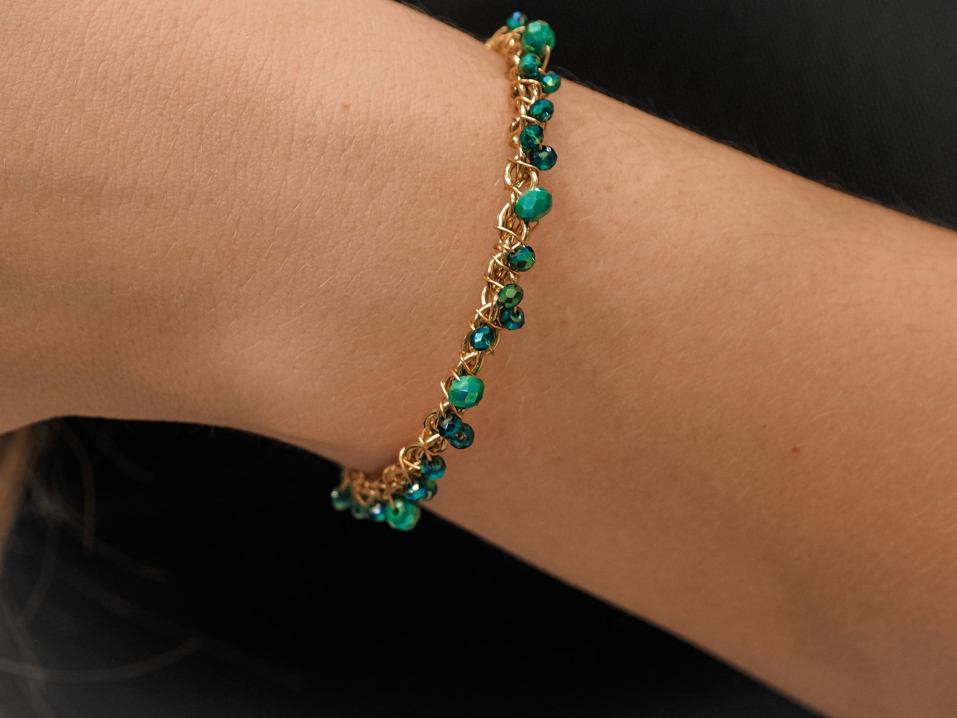Bracelet jonc en acier inoxydable doré ou argenté qui s'adapte parfaitement aux poignet, avec perles facettés couleurs bleu nuit, gris argenté, vert, ou doré bronze.