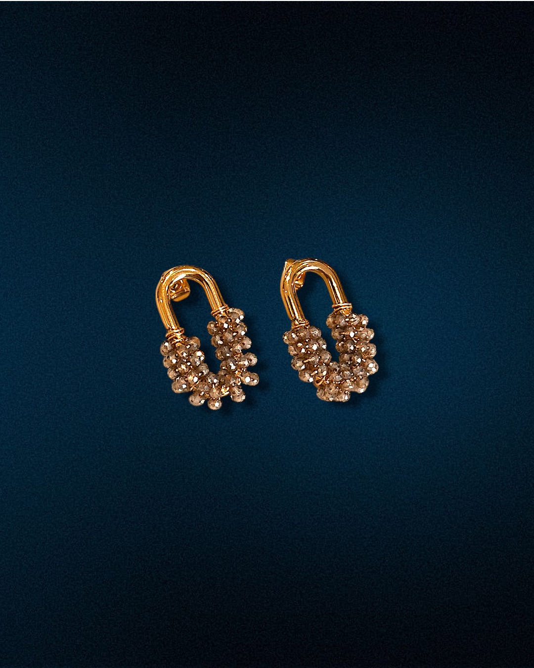 Petites boucles d'oreilles tissées à la main en acier inoxydable doré, ornées de petites pierres semis précieuses.