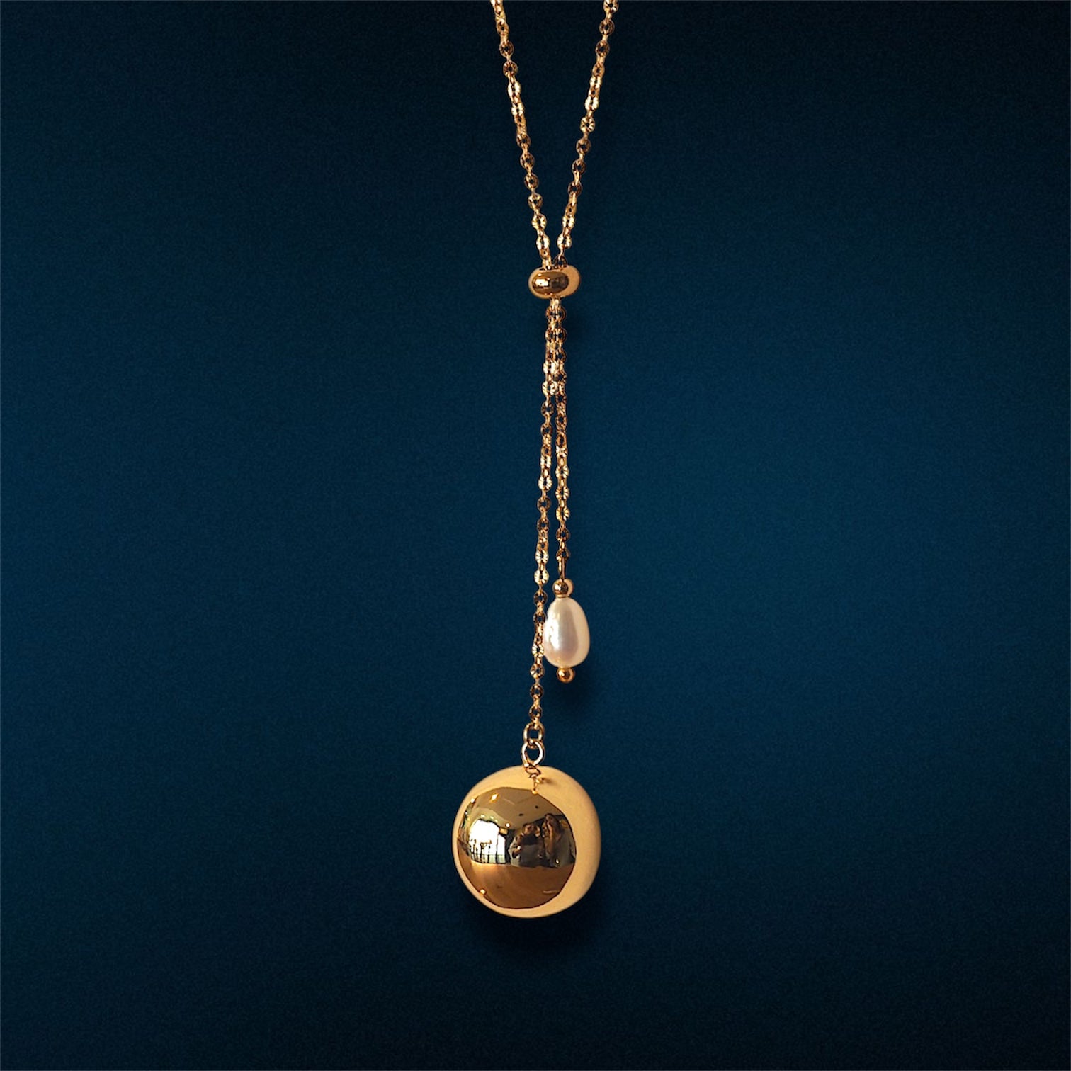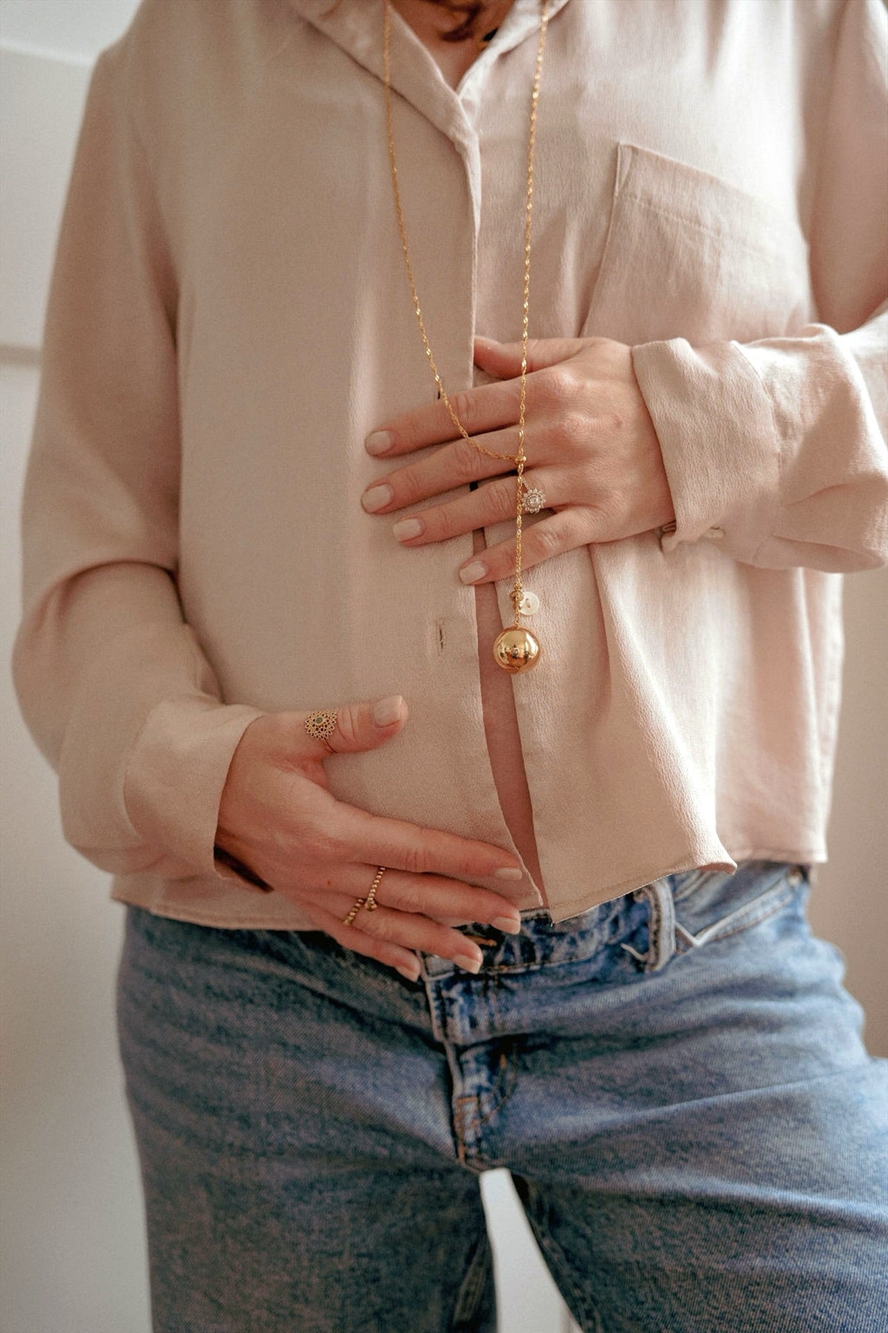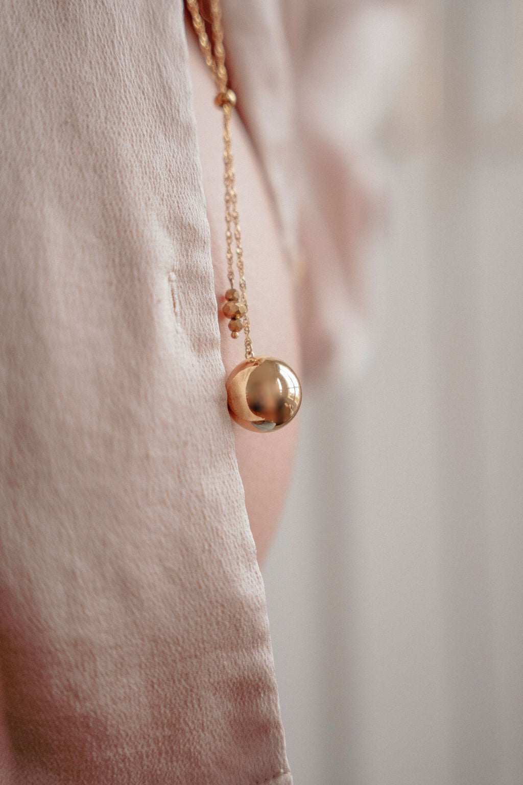 Collier Bola de grossesse, avec chaîne en acier inoxydable longueur 110cm avec perles à facettes ou perles d’eau douce naturelles . Disponible en doré et argenté.